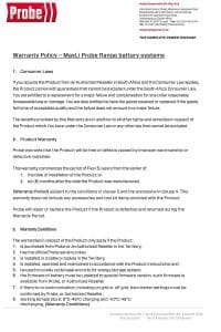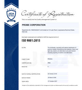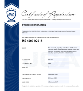 Company Documents Probe Company Profile Probe Energy Company Profile ISO 45001 Conformance Certificate ISO 9001: Conformance Certificate Probe Credit Application Probe COD Application Probe Credit Limit Increase Application Alternator & Starter Warranty Battery Warranty Charger Warranty Electrical Warranty Horton Warranty Inverter Warranty Maxli Warranty ISO 9001: Certificate of Registration 2026 ISO 45001: Certificate of Registration 2026